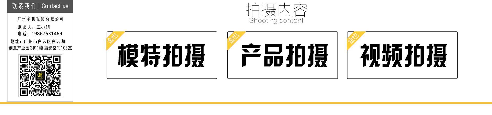廣州金也攝影有限公司 聯(lián)系人:莊小姐 電話:19867631469(微信) 地址:廣州市白云區(qū)白云湖創(chuàng)意產業(yè)園G棟1樓 攝影空間103室 |